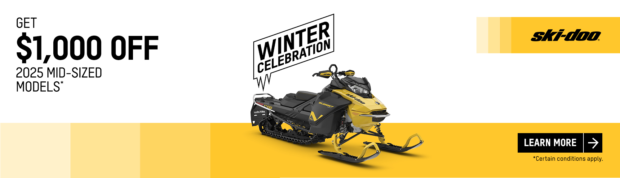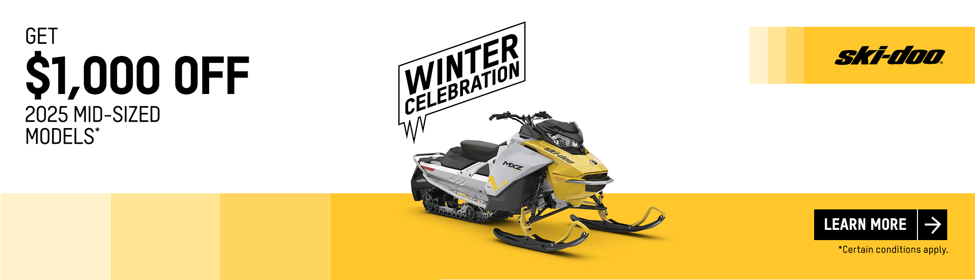 Get a $1,000 rebate on 2025 Mid-Sized Snowmobiles (deep snow)